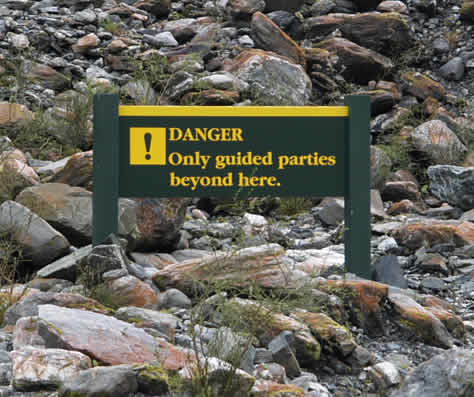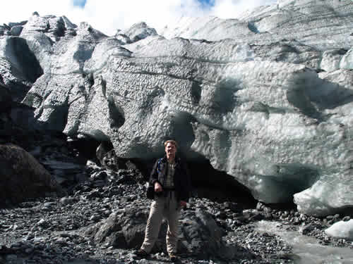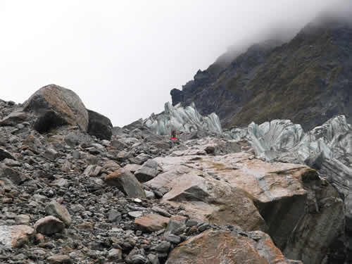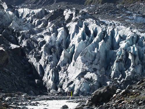 This morning's main agenda item was to follow up our glimpse of Fox Glacier with a walk up to the terminal face. The walk itself was pretty mild, as the car park is no more than half an hour easy walk from the main viewing point. (The yellow box surrounds a group of people standing at the foot of the glacier) Once we got to the bottom, I followed my "experienced alpine guide", Mr. Wellman, beyond the ropes and down to the face of the glacier.