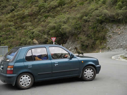 Stopping at the side of the road at a "scenic viewpoint," we were accosted by another group of Kea, who decided that our campervan was not only a good perch, but potentially good for eating.