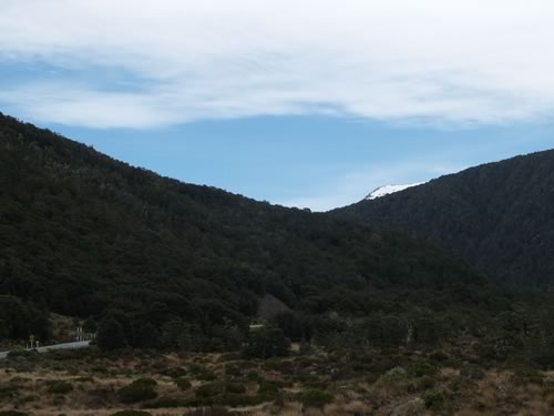After recovering from the loss of "our team" the All Blacks, we got up late, uploaded yesterday's pictures, checked our various email messages and left for the day. The weather looked pretty variable (read "fine for ducks") in all directions, so we decided to head back to the West Coast in hopes that we would find something more enticing there. Here is a picture of the blue sky tease that the mountains gave us this morning: