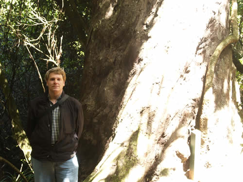 Fortunately, our adventure wasn't over. One of the benefits to going off of the beaten path (and the map for that matter) is that we have found many tracks and trails that were not documented in any of our guidebooks or maps. Today's treat was the Big Rimu Tree Walk. The walk winds for about an hour (round trip) through a native-growth forest with a set of 15 markers with information about each of the trees and plants scattered throughout the walk. The target was the Big Rimu Tree (shown with me for scale):