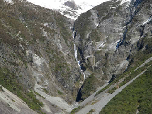 After finishing a huge (and too expensive) breakfast, we headed out to Tasman Valley to go see the glacier. Looking at the map, it appeared to be our best bet at actually coming close to one in the Southern Alps (there will be more chances when we are on the west side of the island). The drive was pretty and we happened across a cascade of waterfalls that looked absolutely gorgeous.