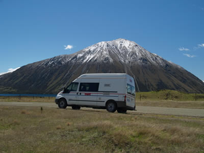 After leaving the Mount Cook area and heading south, we drove through Twizel and picked up miscellaneous supplies and fuel. Coming out of the town, we moved on to Lake Ohau, another beautiful lake with surrounding mountains. The area is used for skiing in the winter (season having just ended) and in the summer as a watersport area. We approached in our van and then headed on. For those of you with interest, here is a picture.