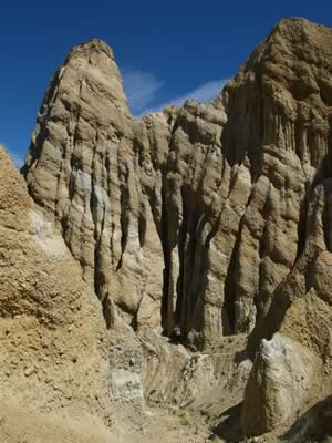 While travelling NZ8 down towards Wakitata, we noticed a sign for Clay Cliffs and decided to go track it down. Continuing our theme of dragging the camper van over rough terrain, this trek involved a significant chunk of gravel road, some of which was pretty ugly. In the end, the views were very nice. The area is made of clay with erosion effects that have carved channels and made geological formations. As you can see, the light is a bit cheeky here, but the sights were good.