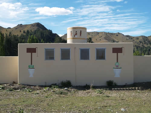 For those who don't know, about 70% of the power in New Zealand comes from hydroelectric facilities, much of it on the South Island. We stopped by the visitor center at Benmore Dam and got an education in the facility and its sister facilities along the Waitaki River. The combination of six lakes and eight facilities provides about 3.6GWh of power per year, or about 1,000kWh per Kiwi. However, although the dam was pretty, the most visually stunning part of the scenery was the lavatories, featured below: