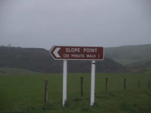 Our first stop today was Slope Point, the southernmost point of the South Island. Although we didn't make it to the marker 20 minutes away (due to driving rain), we did get some pictures of the pointer to the point.