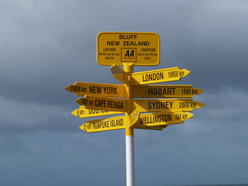 Bluff, southernmost point directly adjacent to Invercargill, was the site of our breakfast today. The eggs and toast were good, but the coffee and hot chocolate left a bit to be desired. However, by waiting out the rain in the warm café, we managed to get some better pictures of the international signage at the end of the road.