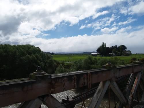 One of the nice surprises was the Clifden Suspension Bridge. This site, located a mere 300m from the main road, is a suspension bridge originally opened in 1899. It's a sturdy bridge over what is usually a fairly calm river (the Waiau). In 1976, a hydro plant was built upstream that cut the flow from 400 cumecs (cubic meters per second) to around 1 cumec. This was later "fixed" through an agreement and the construction of another dam to a more sustainable 12-16 cumecs. Well, today we got to see the river from bank to bank due to the rain conditions.