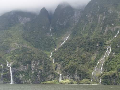 | The drive for Milford Sound takes about 2½ hours by car. It's a windy road through mountains, along rivers and creeks, and by many spectacular waterfalls. Since we needed to be at the town of Milford Sound by noon, we kept the number of stops to a minimum on the way there. Further, the weather was not particularly cooperative for picture taking, so that seemed like a prudent measure. | |