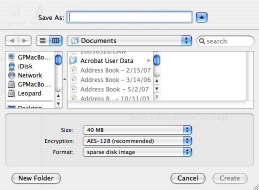 The best part about Disk Images is that they can be encrypted. As such, it's like carrying around a password-encrypted thumb-drive without having to carry around the thumb drive. Of course, unlike a thumb-drive, if you lose your laptop, your Disk Image is gone as well, so you will still need to back them up. In fact, you could store your Disk Image on a thumb drive if you wanted to be very secure (but don't lose the thumb drive). As you can imagine, another benefit of encrypted Disk Images is that they can be backed up by dragging the encrypted Disk Image to another computer or hard drive or thumb drive or putting it on tape. No matter where you put it, the data remains encrypted.