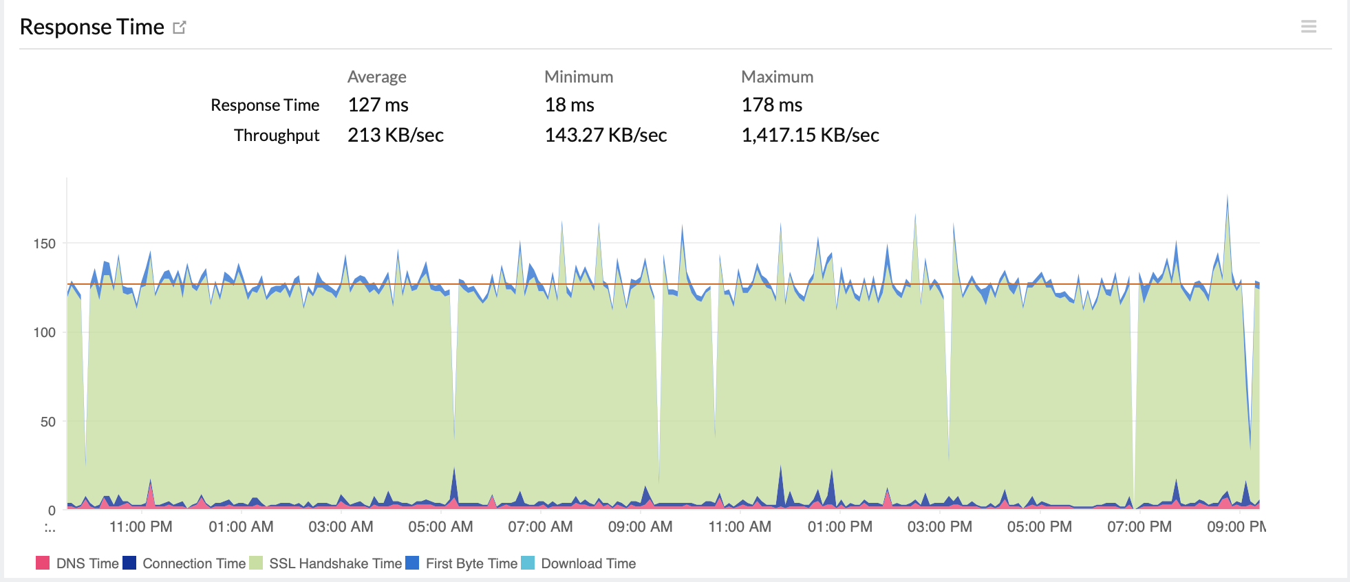 Not only are things still looking super zippy (average time to deliver of 127ms), but it's pretty darned consistent. Not surprisingly, most of the time (90+% of it) is spent doing the TLS handshake.